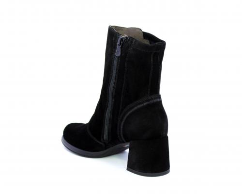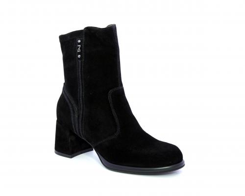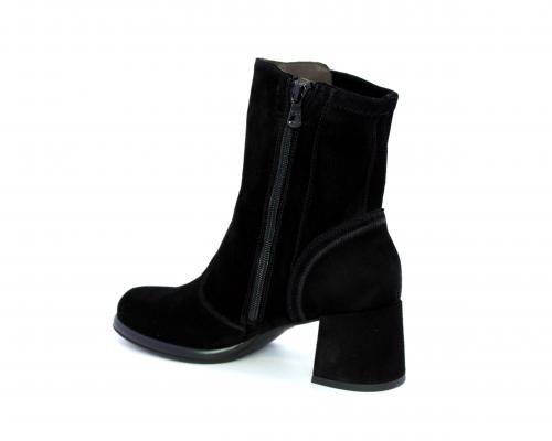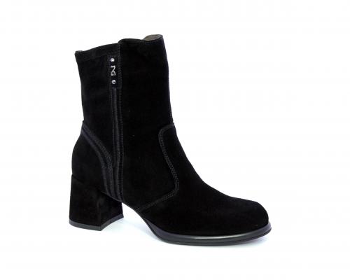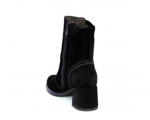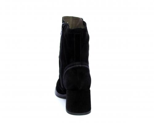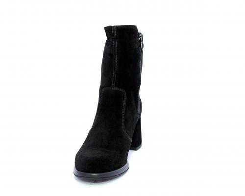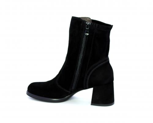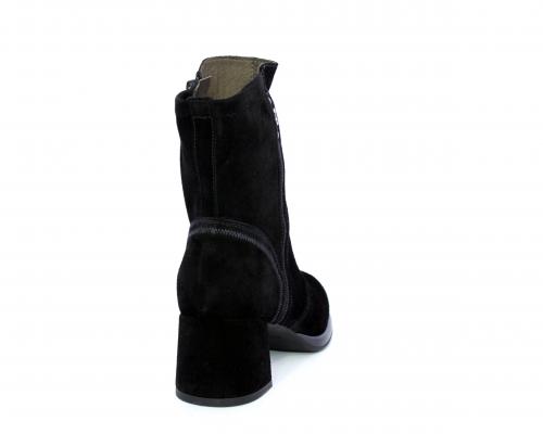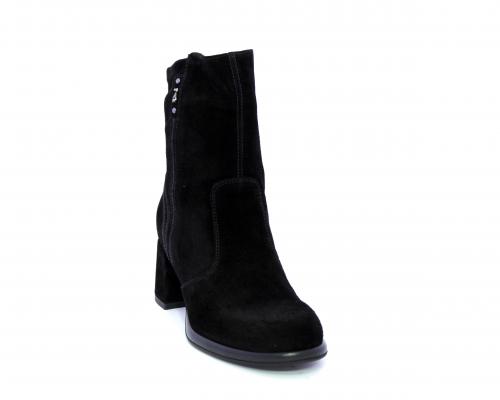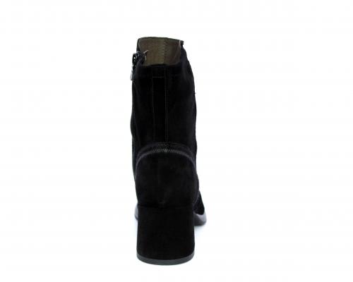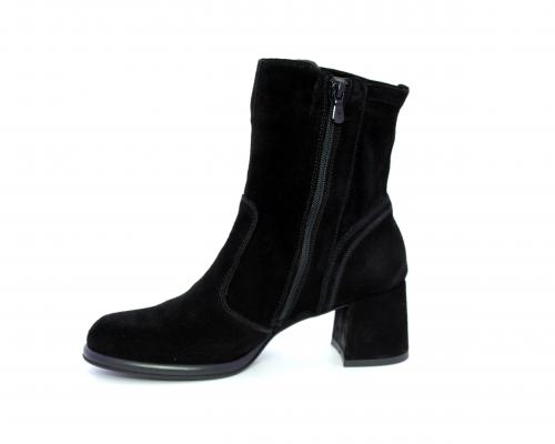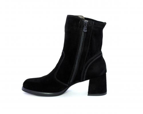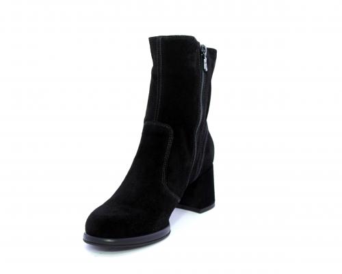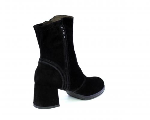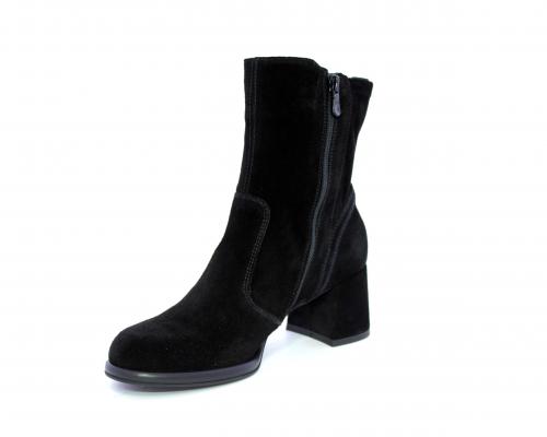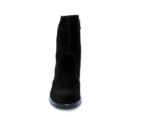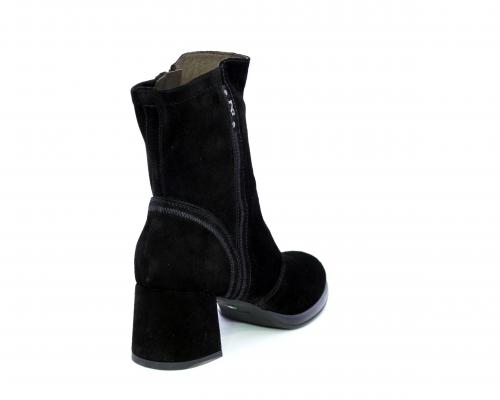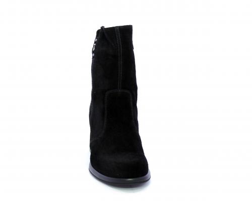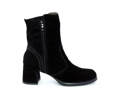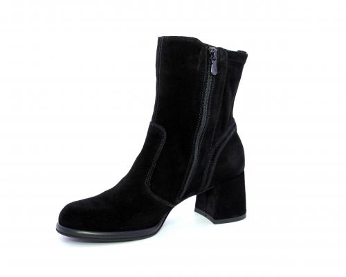 Tronchetto con punta tonda, chiusura laterale, tacco largo rivestito in camoscio, tomaia in camoscio con parte laterale in tessuto elasticizzato, sottopiede e fodera interna in pelle, fusbet con memory.