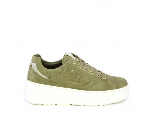 Sneakers con lacci, zeppa e platform in gomma, tomaia in camoscio con rifiniture platino, sottopiede in tessuto, fodera interna in pelle, fusbet estraibile in poliuretano Dry-Go, con doppia capacità sia assorbire il sudore sia di asciugarsi rapidamente, inoltre ha anche la funzione MEMORY che si modella al piede garantendo confort e benessere.