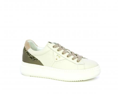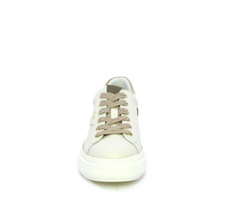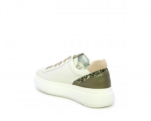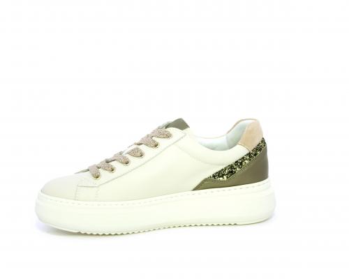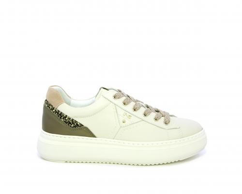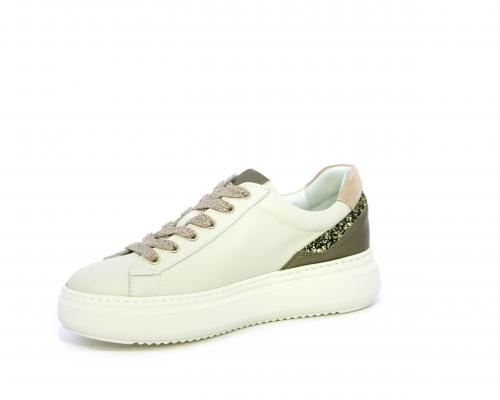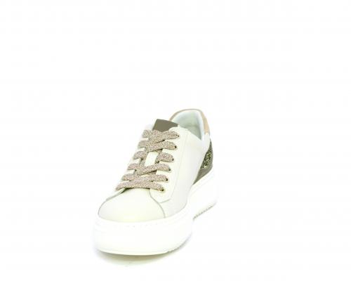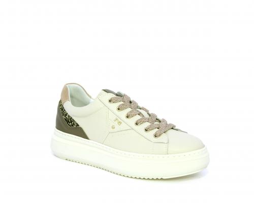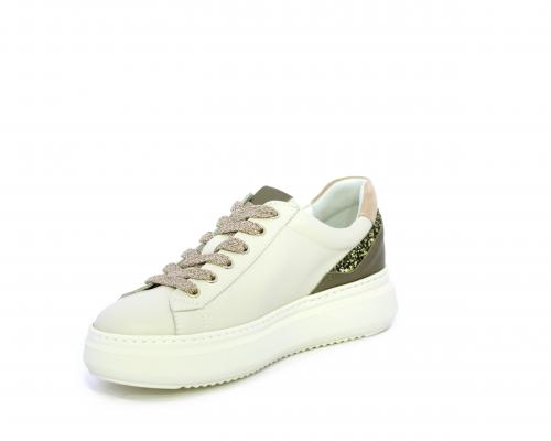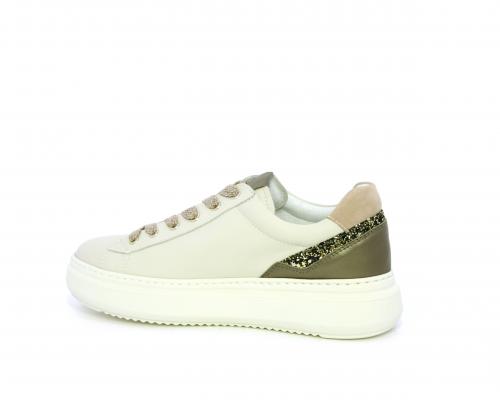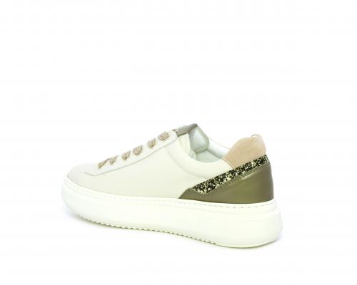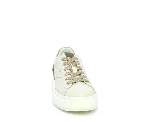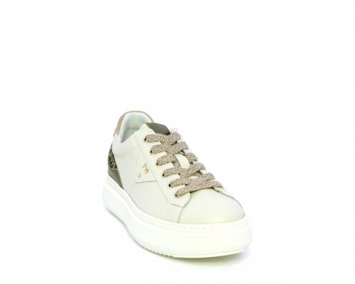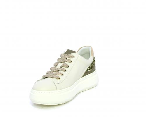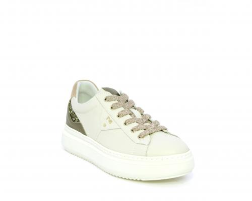 Sneakers con lacci, platform in gomma, tomaia in pelle con inserto in lurex al tallone, sottopiede in tessuto, fodera interna in pelle, fusbet estraibile in poliuretano Dry-Go, con doppia capacità sia assorbire il sudore sia di asciugarsi rapidamente, inoltre ha anche la funzione MEMORY che si modella al piede garantendo confort e benessere.