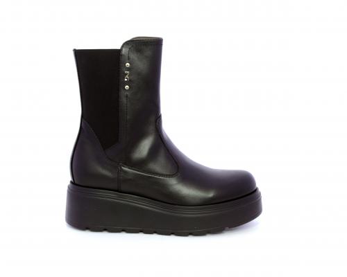 Tronchetto con zeppa e plateaux in gomma, chiusura laterale, tomaia in pelle con parte laterale in tessuto elasticizzato, sottopiede in tessuto, fodera interna in pelle,fusbet estraibile in poliuretano Dry-Go, con doppia capacità sia di assorbire il sudore sia di asciugarsi rapidamente, inoltre ha anche la funzione MEMORY che si modella al piede garantendo confort e benessere.