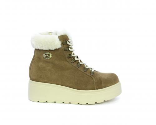Tronchetto con zeppa e plateaux in gomma, con lacci e chiusura laterale, tomaia in camoscio con pelliccia ecologica, sottopiede in tessuto, fodera interna in pelle,fusbet estraibile in poliuretano Dry-Go, con doppia capacità sia di assorbire il sudore sia di asciugarsi rapidamente, inoltre ha anche la funzione MEMORY che si modella al piede garantendo confort e benessere.