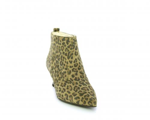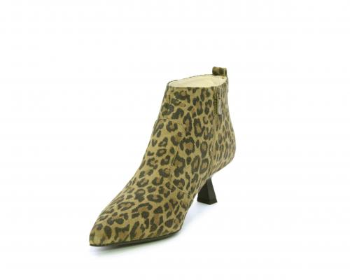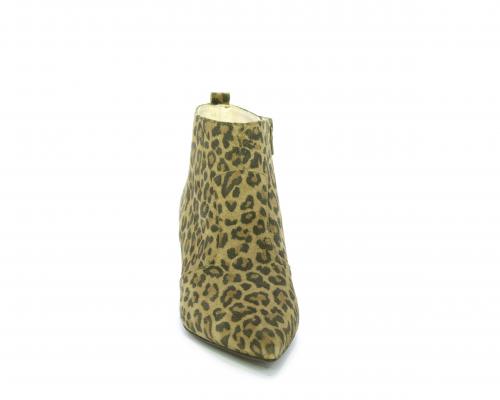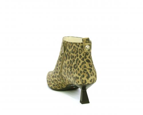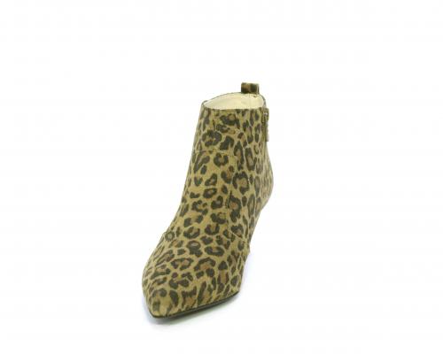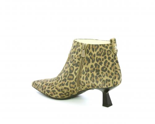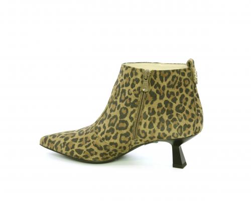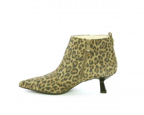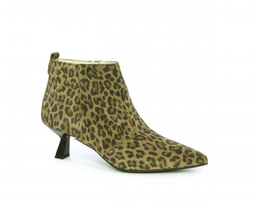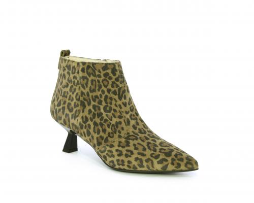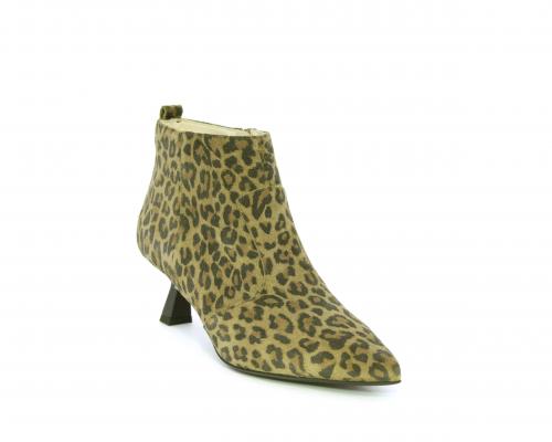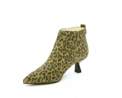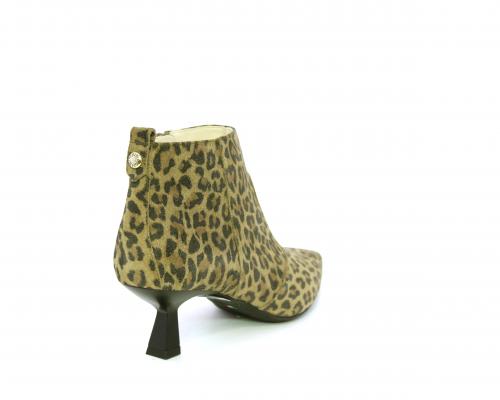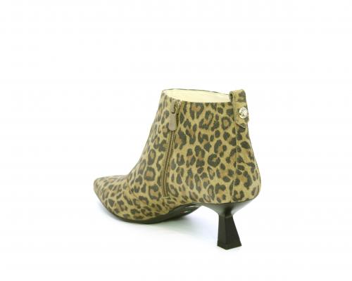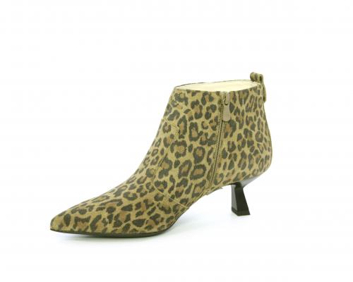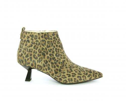 Tronchetto con chiusura laterale, tacco a rocchetto, tomaia in suede maculato, sottopiede e fodera interna in pelle, fusbet con memory.
