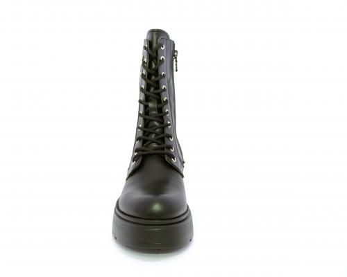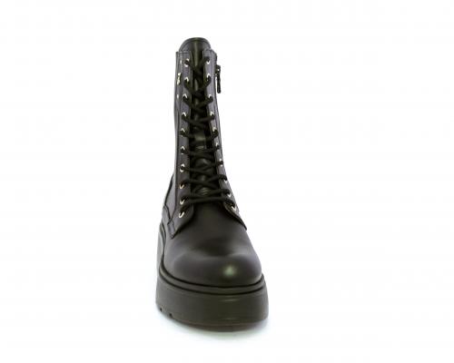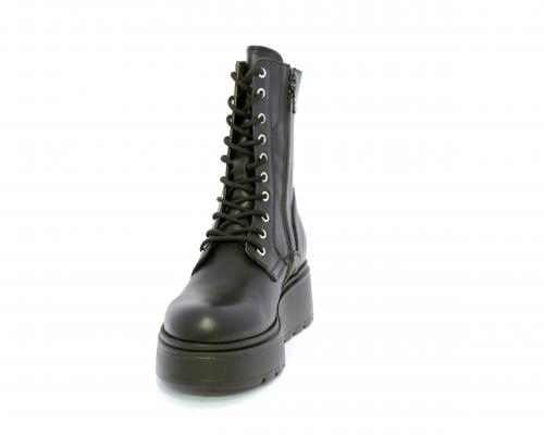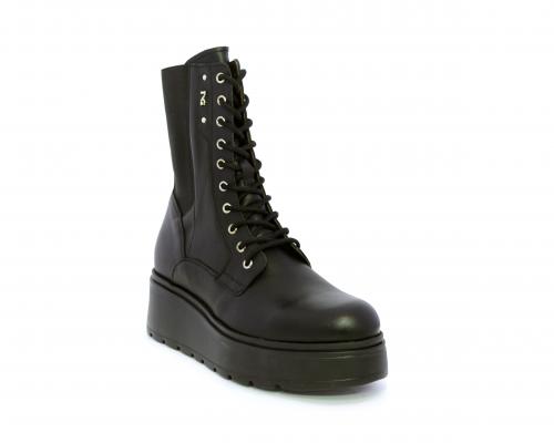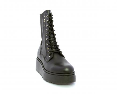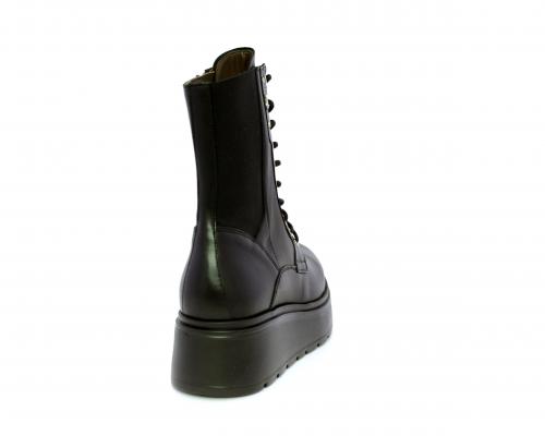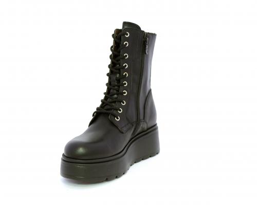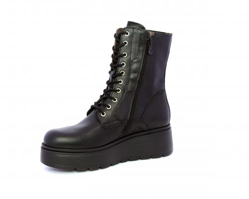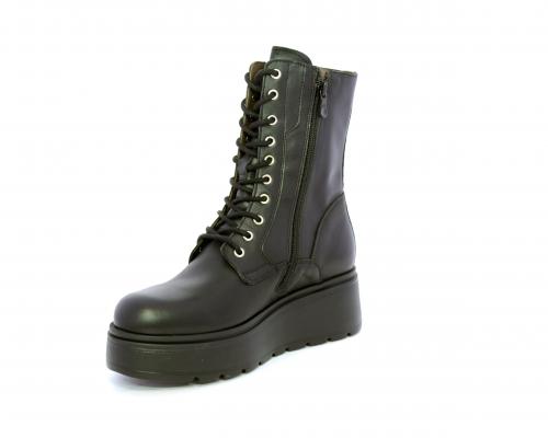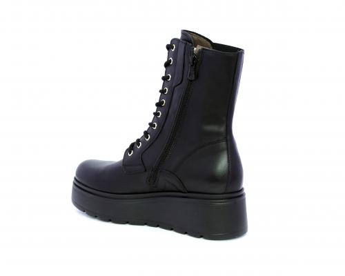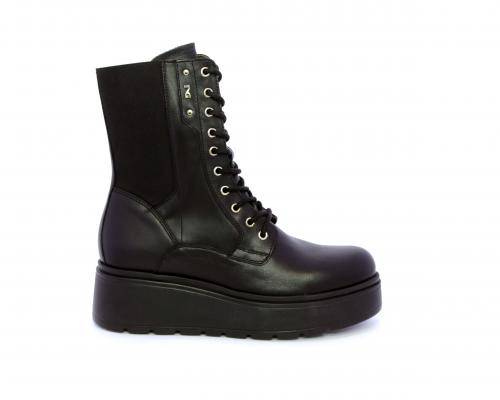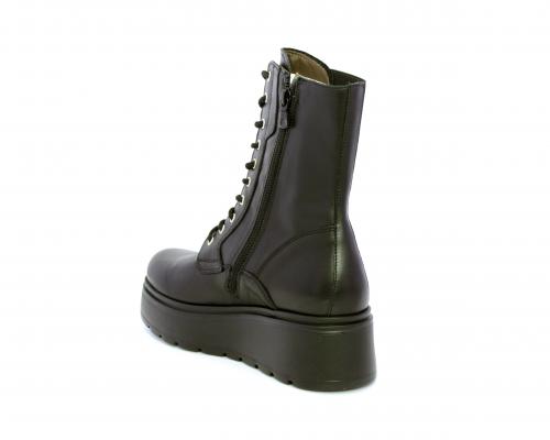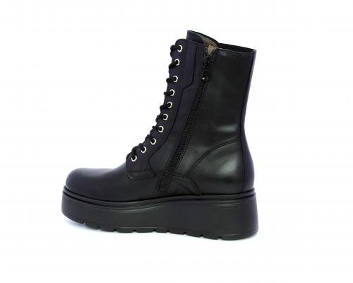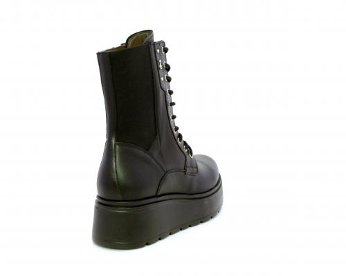 Tronchetto con lacci e chiusura laterale, zeppa e plateaux in gomma, tomaia in pelle con parte laterale in tessuto elasticizzato, sottopiede in tessuto, fodera interna in pelle,fusbet estraibile in poliuretano Dry-Go, con doppia capacità sia di assorbire il sudore sia di asciugarsi rapidamente, inoltre ha anche la funzione MEMORY che si modella al piede garantendo confort e benessere.