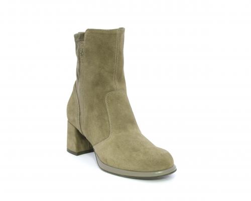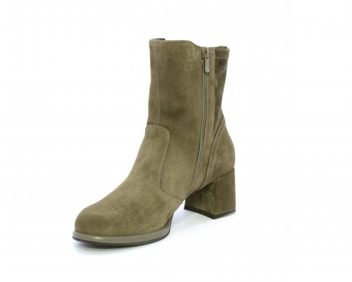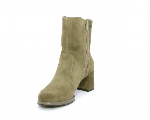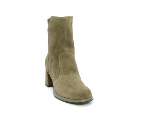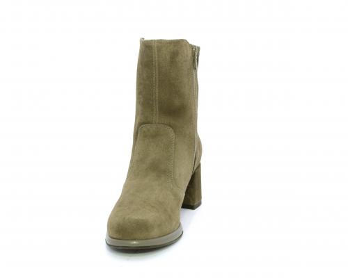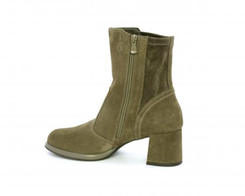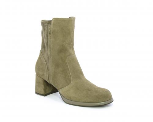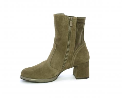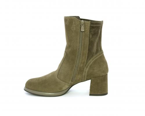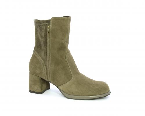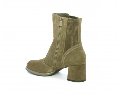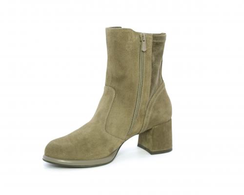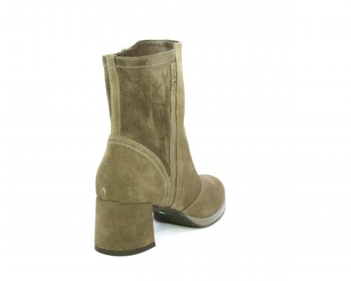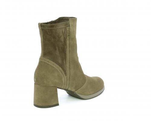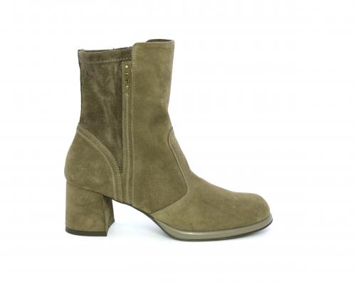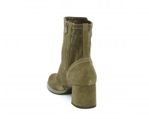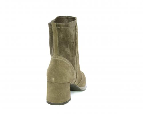 Tronchetto con punta tonda, chiusura laterale, tacco largo rivestito in camoscio, tomaia in camoscio con parte laterale in tessuto elasticizzato, sottopiede e fodera interna in pelle, fusbet con memory.