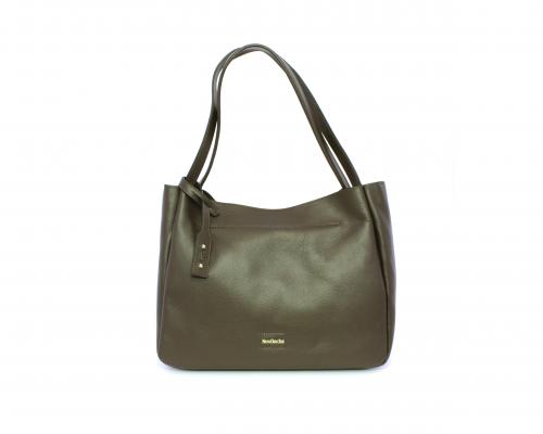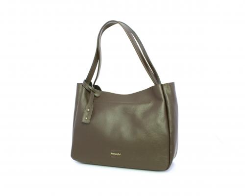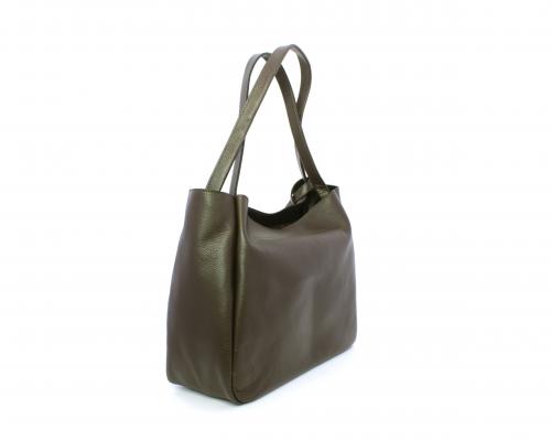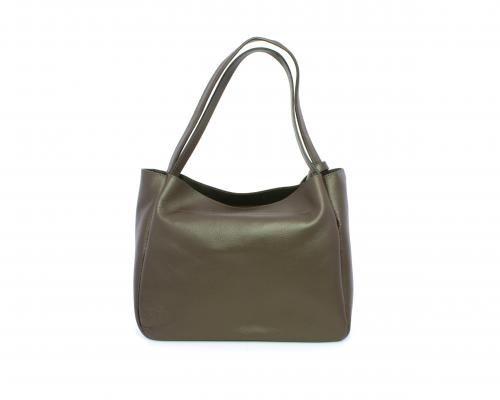Borsa monospalla in pelle, forma rettangolare, doppio manico lungo in pelle, rifiniture in acciaio, chiusura generale della borsa con cerniera, all'interno pochette in pelle che può essere anche staccata.