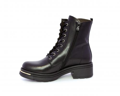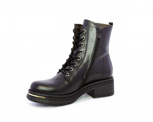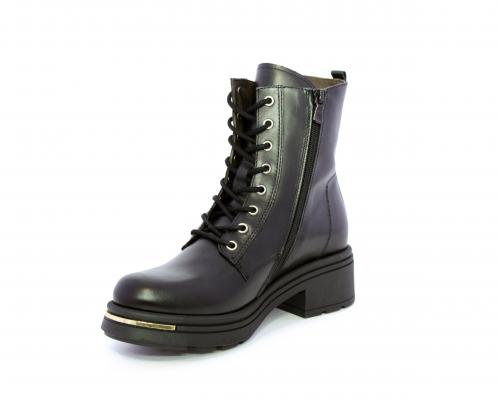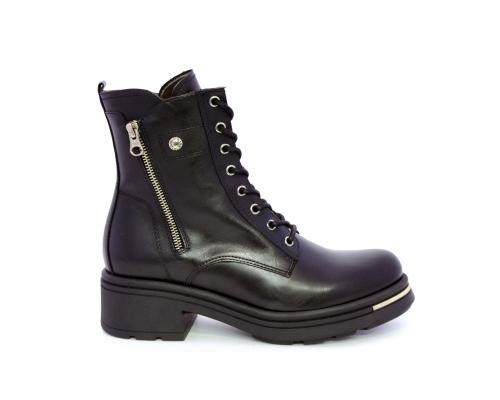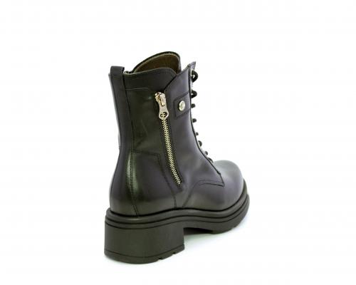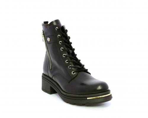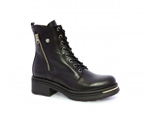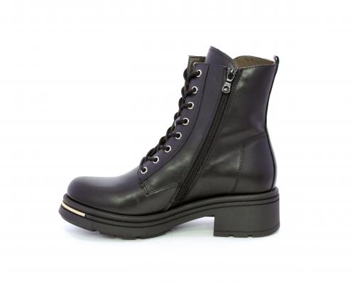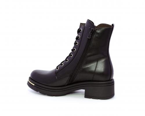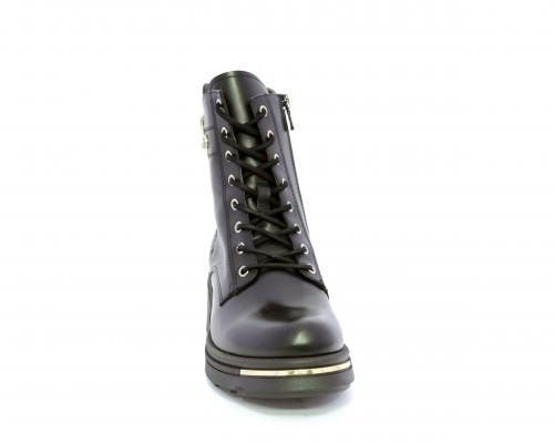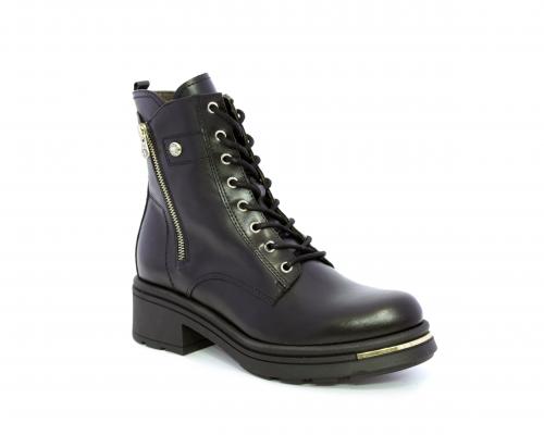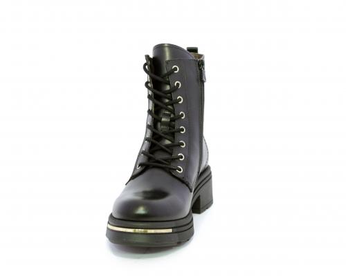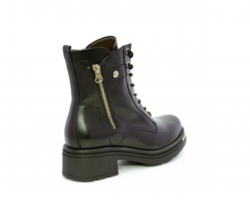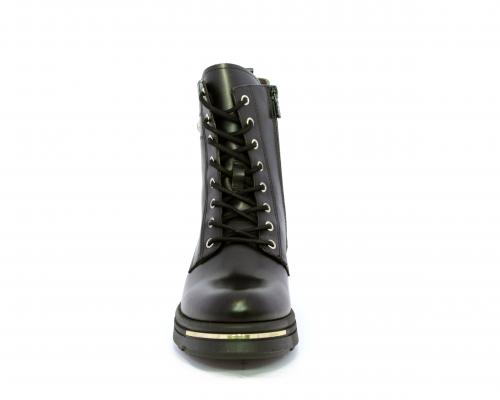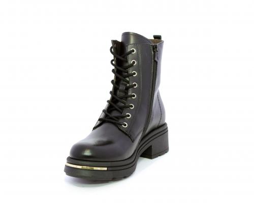 Tronchetto con lacci e chiusura laterale, tacco e plateaux in gomma, tomaia in pelle con rifitiniture oro, sottopiede in tessuto, fodera interna in pelle,fusbet estraibile in poliuretano Dry-Go, con doppia capacità sia di assorbire il sudore sia di asciugarsi rapidamente, inoltre ha la funzione MEMORY che si modella al piede garantendo confort e benessere.