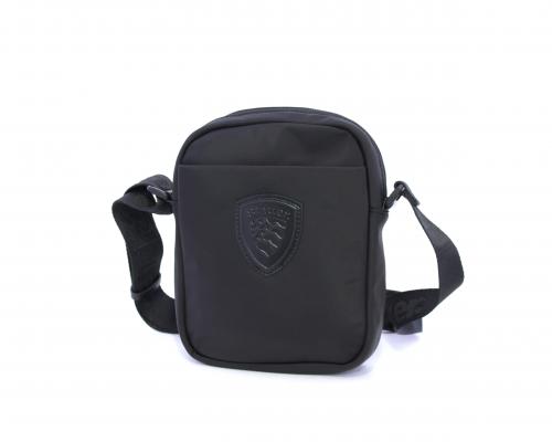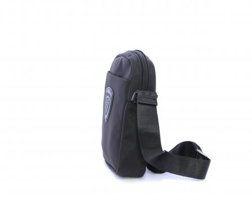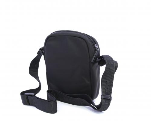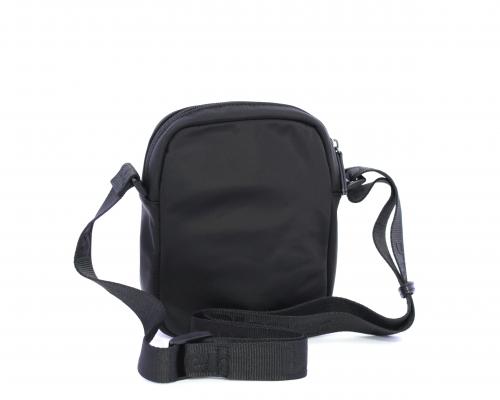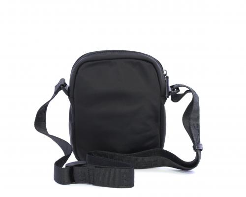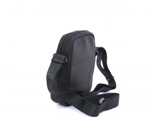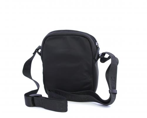 Tracolla in tessuto, taschino anteriore con clip e logo centrale in pelle, chiusura generale con cerniera, tracolla regolabile in tessuto con logo inciso.