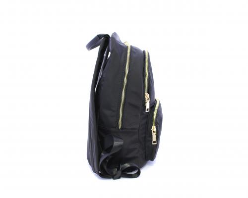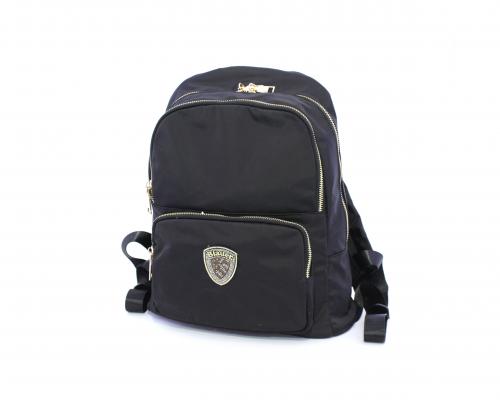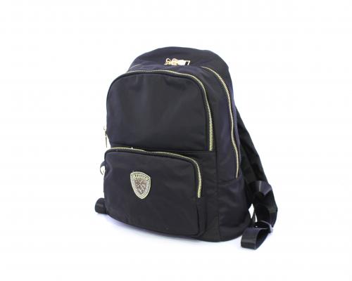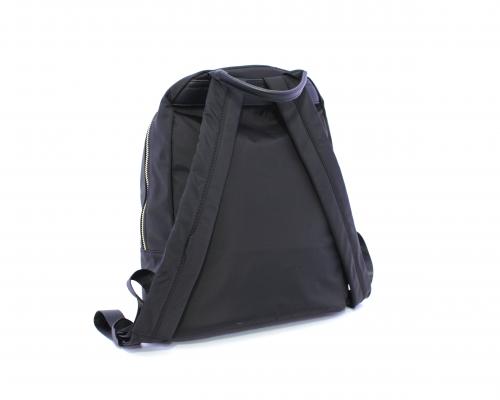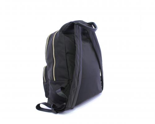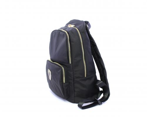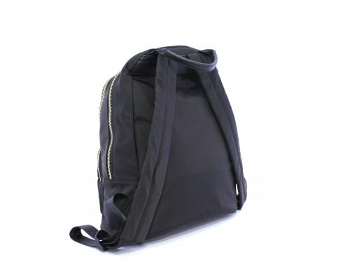 Zaino in tessuto con rifiniture in pelle e tracolle regolabili in tessuto, lo zaino è costituito da uno scomparto grande e due taschini nella parte anteriore uno più grande e uno più piccolo con logo con brillantini, chiusura generale della zaino con cerniera, fodera interna in tessuto e nel vano più grande all'interno c'è un taschino chiuso con zip.
