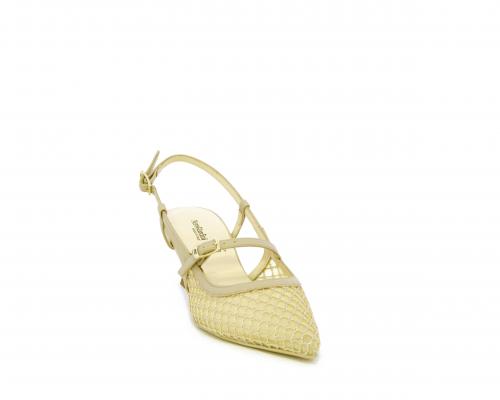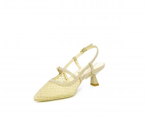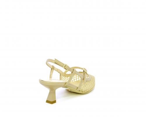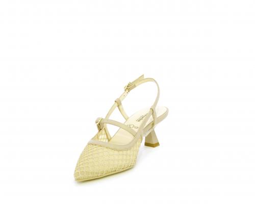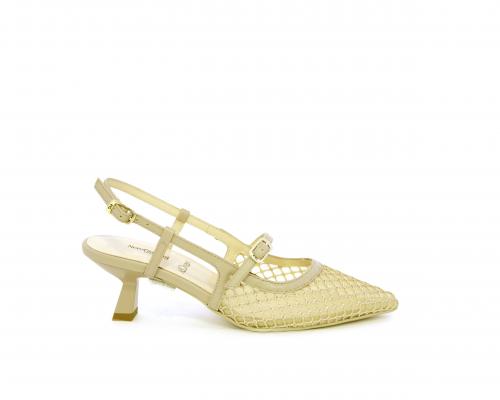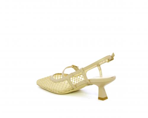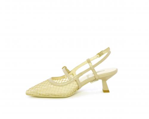 Scarpa modello chanel, fondo in gomma, tacco a rocchetto, tomaia in pelle con parti in tessuto, lateralmente fibbia regolabile, sottopiede e fodera interna in pelle, fusbet dotato di memory ed elevato assorbimento degli urti donando confort e benessere.