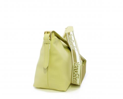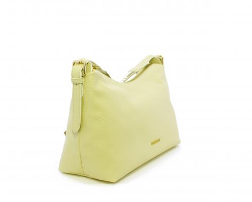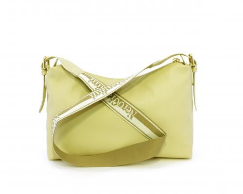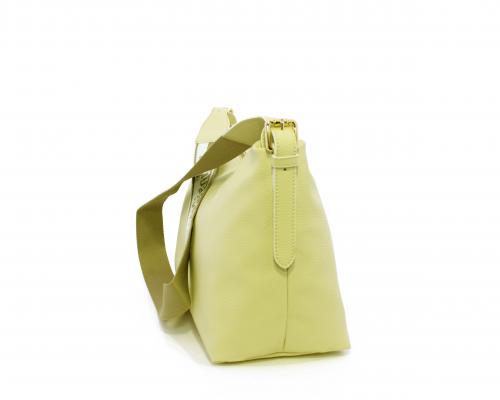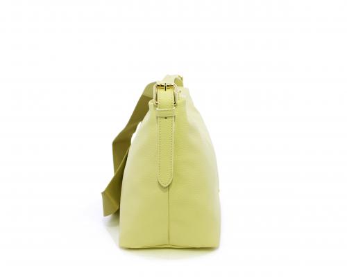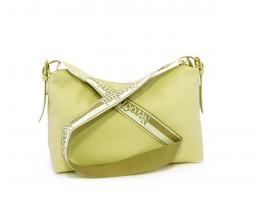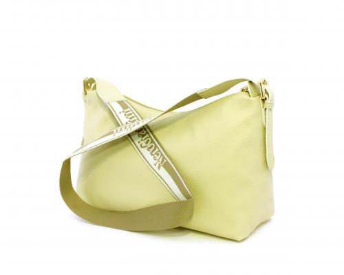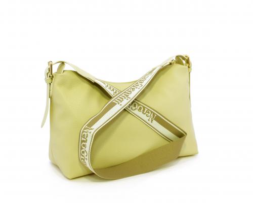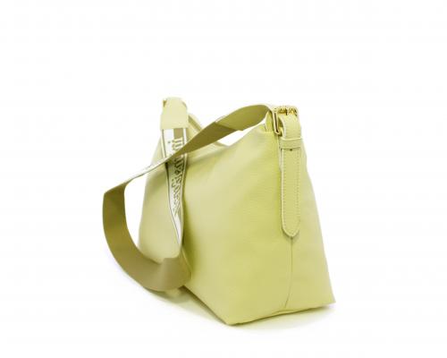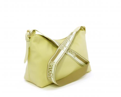 Borsa a tracolla modello sacca, manico lungo in tessuto regolabile, rifiniture color platino, chiusura generale della borsa con cerniera, fodera interna in tessuto, all'interno doppio taschino uno aperto e uno chiuso con zip.
