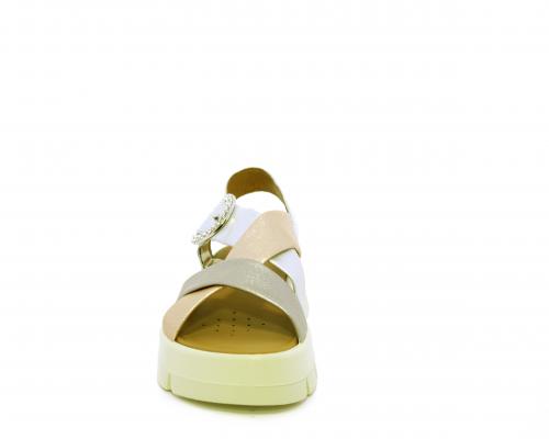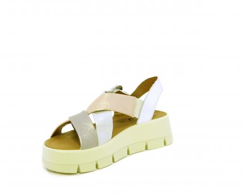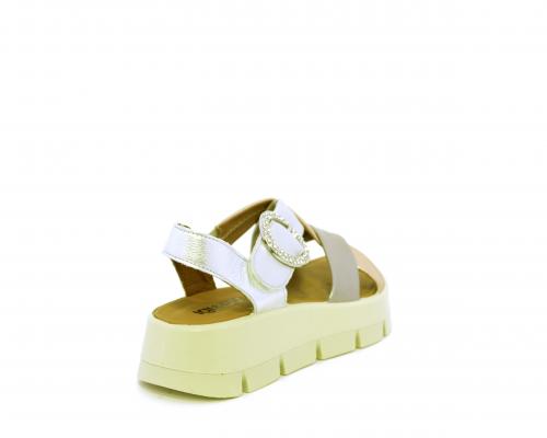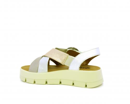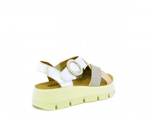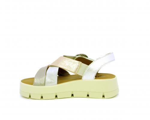 Sandalo con fondo in gomma, tomaia in pelle satinata con incrocio sul collo del piede, fibbia regolabile ed elastico, sottopiede in pelle, fusbet anatomico.