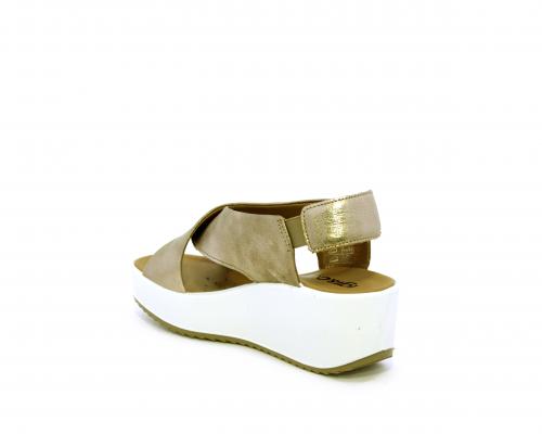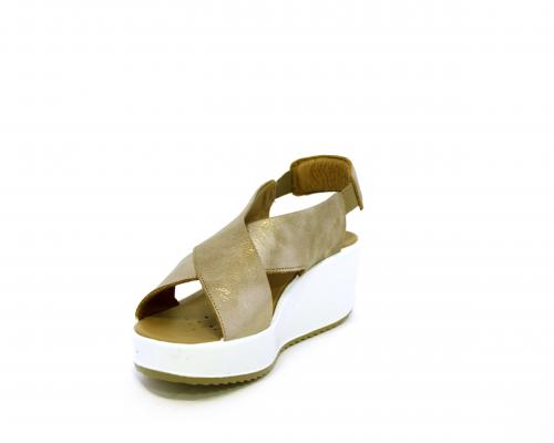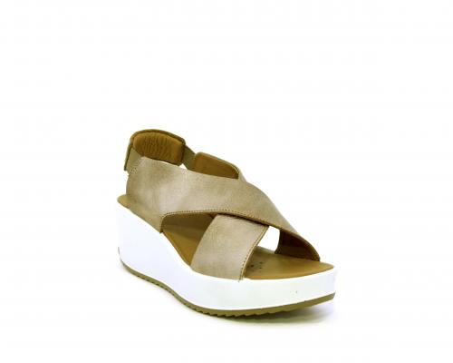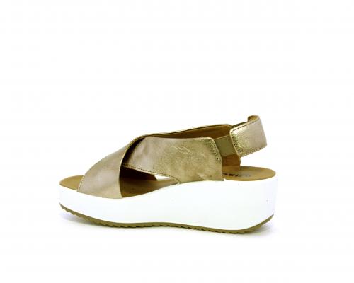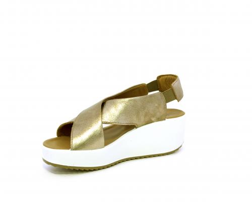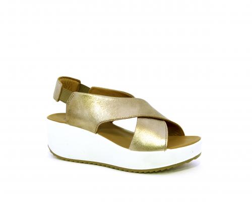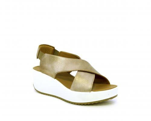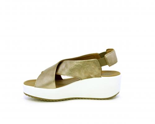 Sandalo con fondo in gomma, tomaia in pelle satinata, modello ad incrocio con doppio elastico al cinturino dietro la caviglia, sottopiede in pelle, fusbet anatomico.
