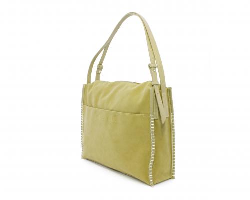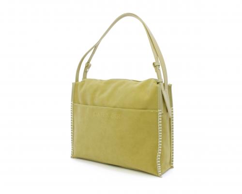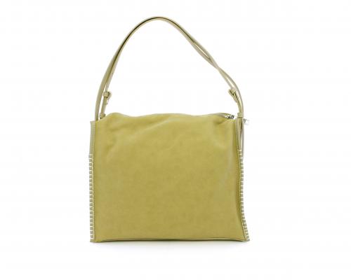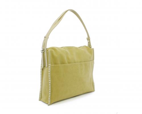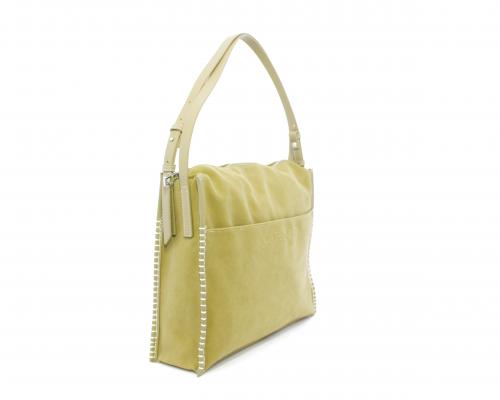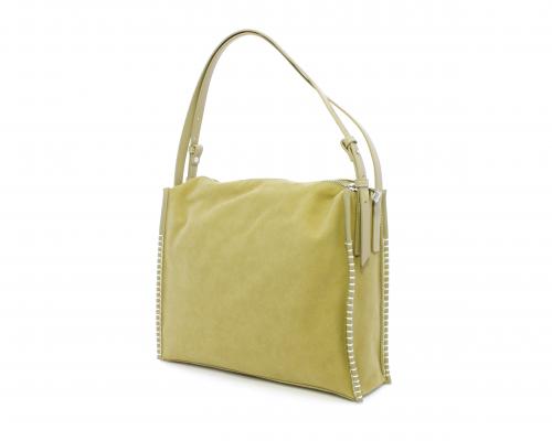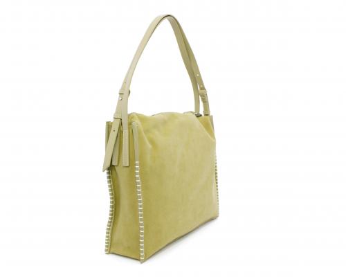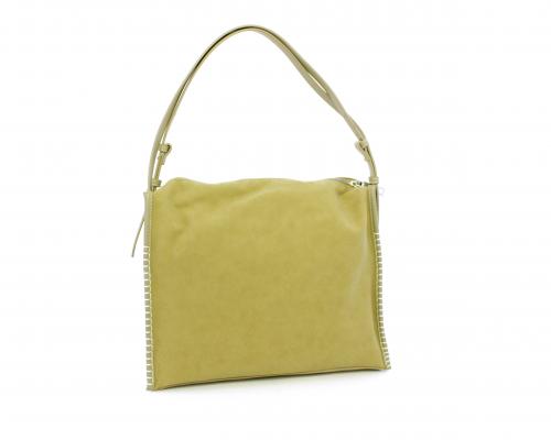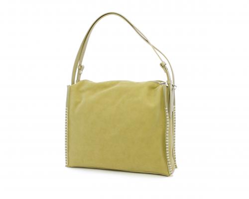 Borsa monospalla con forma rettangolare, doppio manico lungo regolabile, in camoscio e rifiniture in ecopelle, taschino nella parte anteriore con calamita, chiusura generale della borsa con cerniera, fodera interna in tessuto con doppio taschino uno aperto e uno chiuso con zip.