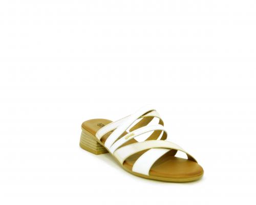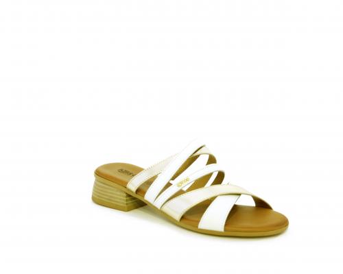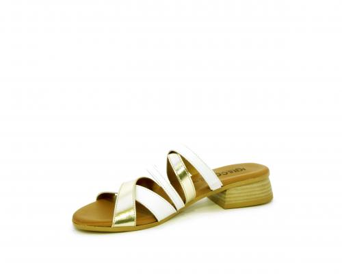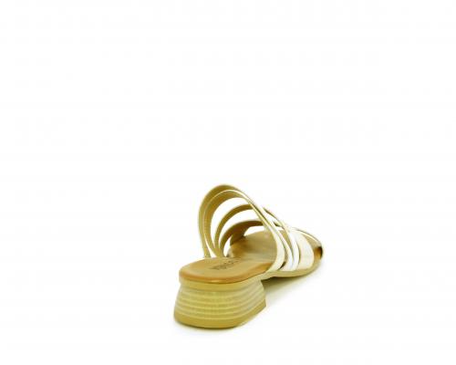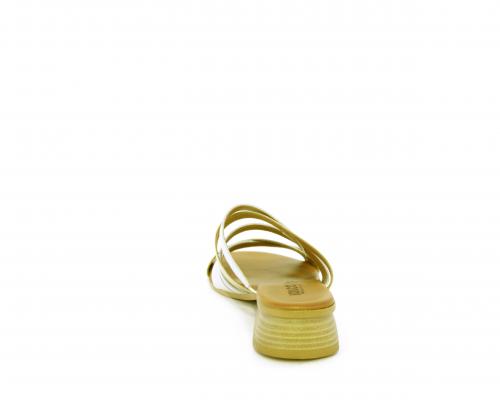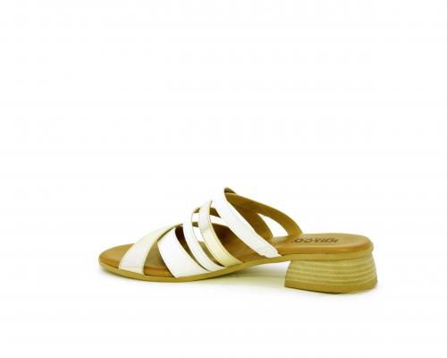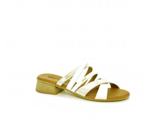 Sandalo con tacco effetto legno, fondo in gomma, tomaia in pelle bianca e pelle satinata platino con elastico alla fascia sul collo del piede, sottopiede e fodera interna in pelle, fusbet con memory.